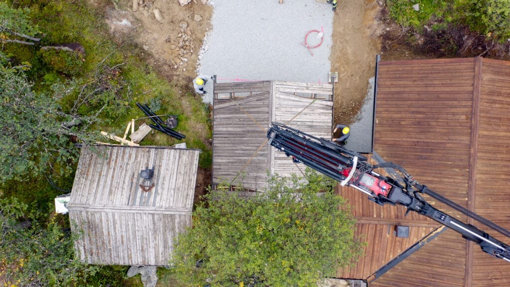 Mindre hus levert av Ålhytta er enkle å flytte. Husa står gjerne på pilarar eller sementblokkar som ligg rett på bakken. I hyttetunet vårt på Sangefjellet, kom uthuset svært tett på den ombygde hytta. I tillegg stod den litt for lågt i terrenget og var utsett for fukt frå vegetasjonen rundt. Med kran var det enkelt å flytte det elementbygde uthuset til nye fundament.